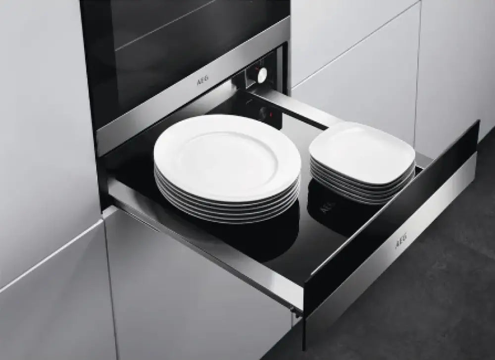 14cm stainless steel built in warming drawer with 6 place settings and fan heat circulation.