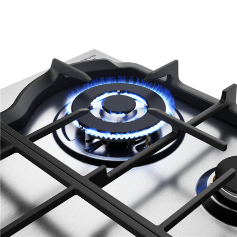 Description: 60cm 4 burner stainless steel gas cooktop with a high powered 14.4 MJ/h wok burner, one-step ignition and cast iron trivets.