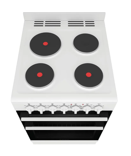 54cm white electric freestanding cooker with separate electric grill, fan forced electric oven, 60 minute timer and a 4 zone solid cooktop.