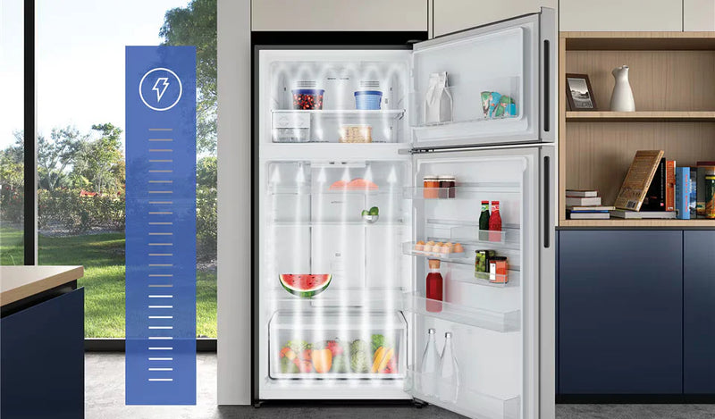 Description: 503L top mount fridge, silver with Autosense smart cooling function, FreshSeal™ sealed crisper with humidity control, Twist & Serve ice maker and 4-star energy rating
